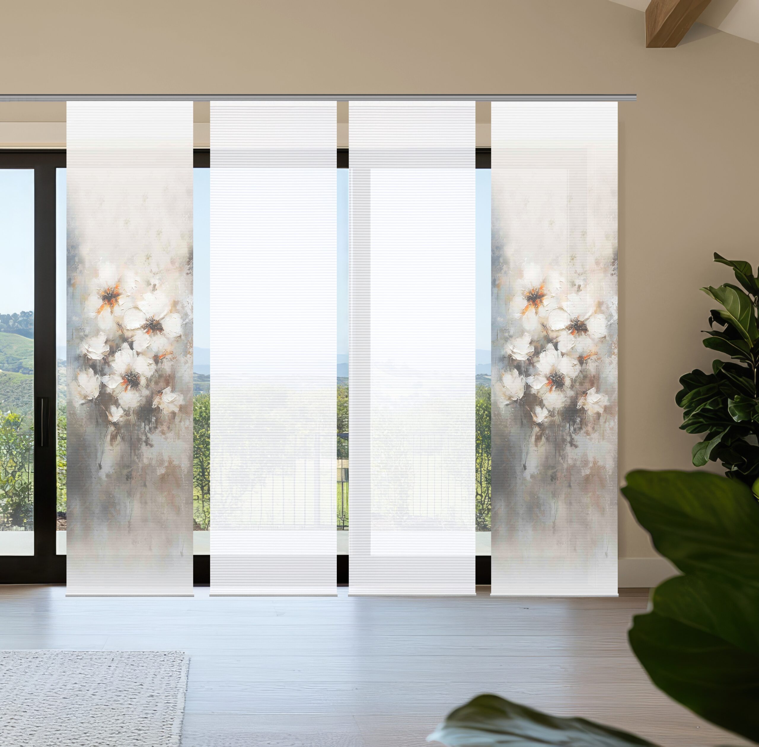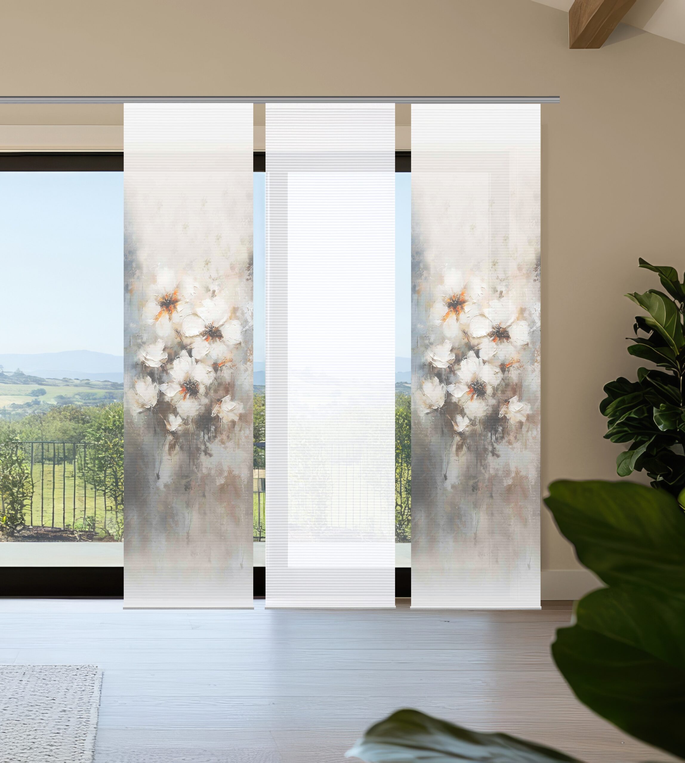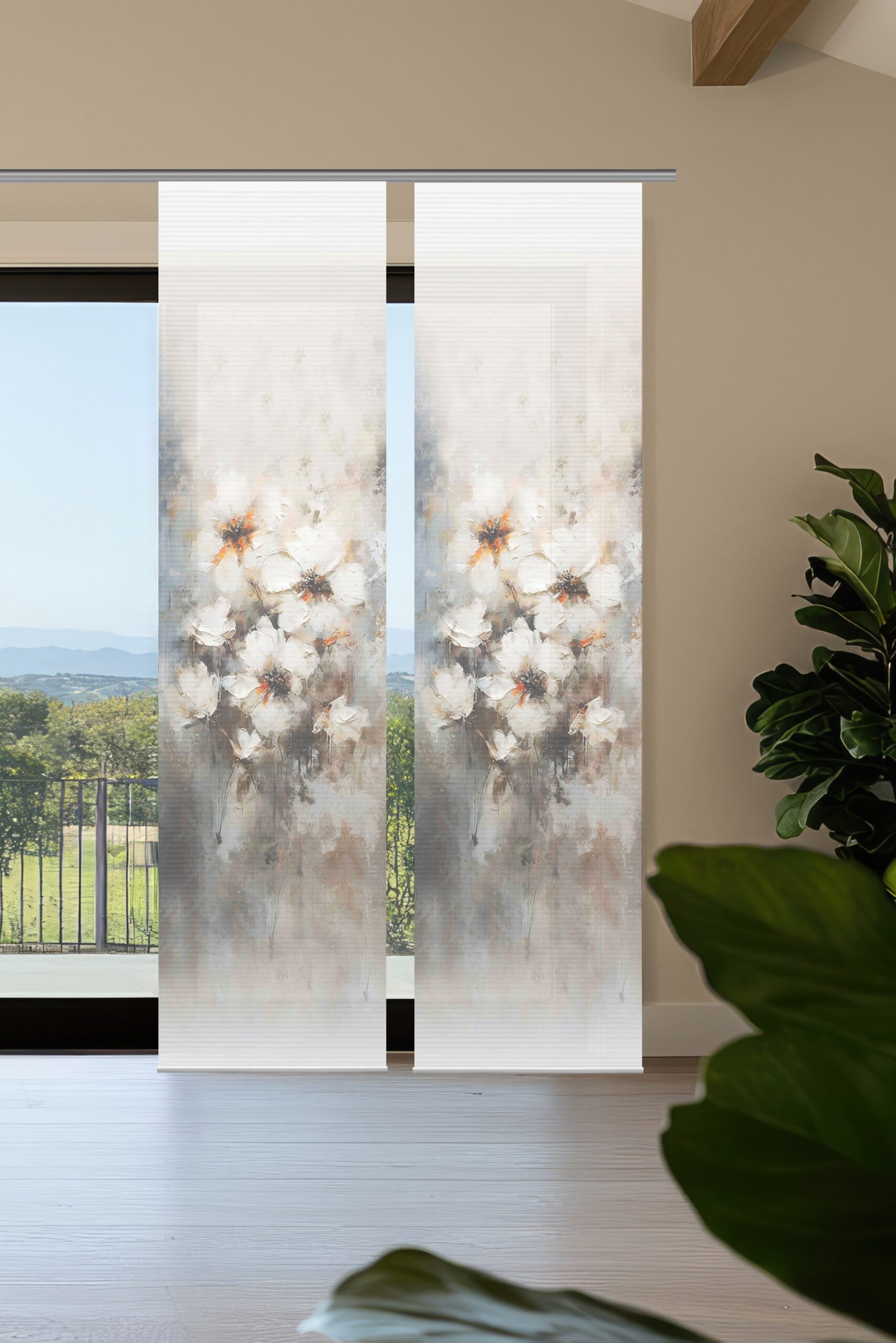 Das Flächenvorhang-Set Aristea kombiniert digital bedruckte Schiebevorhänge mit weißen Uni-Schiebern (jeweils 245×60cm). Die halbtransparente „Bambus-Optik“ zeichnet sich aus durch feine Querstreifen – abwechselnd transparent und blickdicht. Das florale Dekor erstreckt sich vertikal in der Mitte der Vorhangfläche. Die weissen Blüten ähneln einer zarten Aquarellzeichnung auf grauem Untergrund, dadurch ist das Set ein wunderschöner Eyecatcher an Ihrem Fenster.