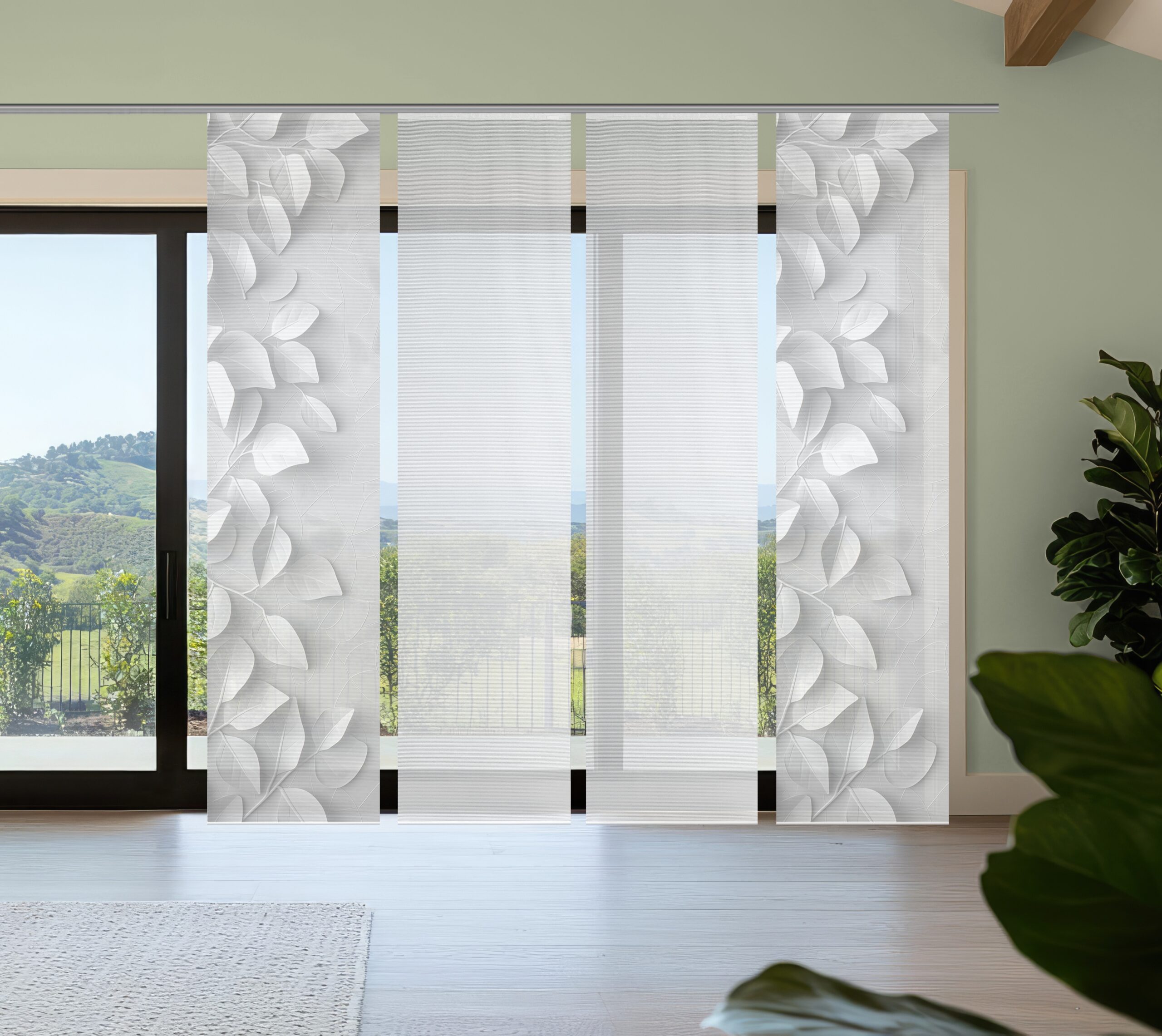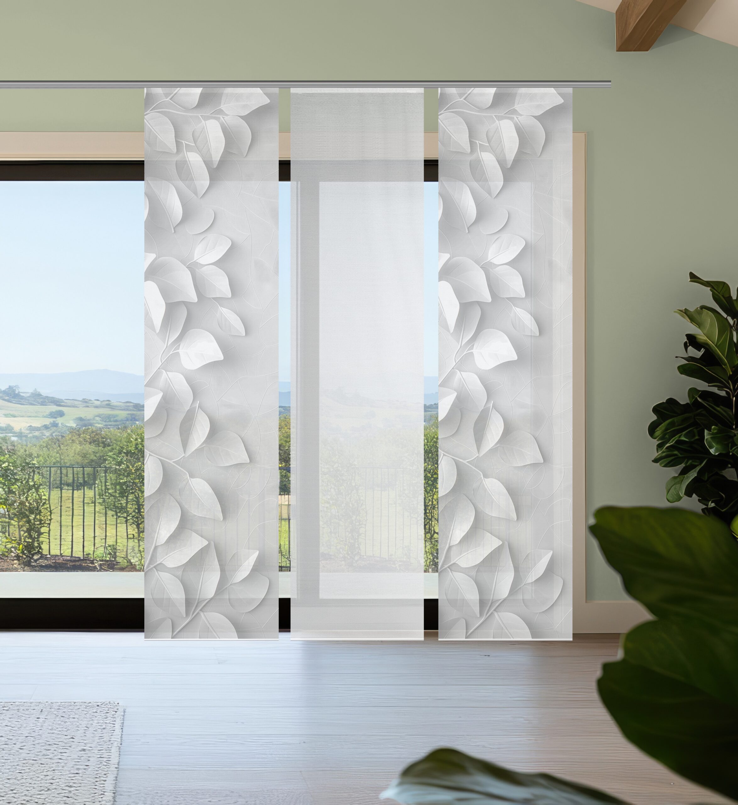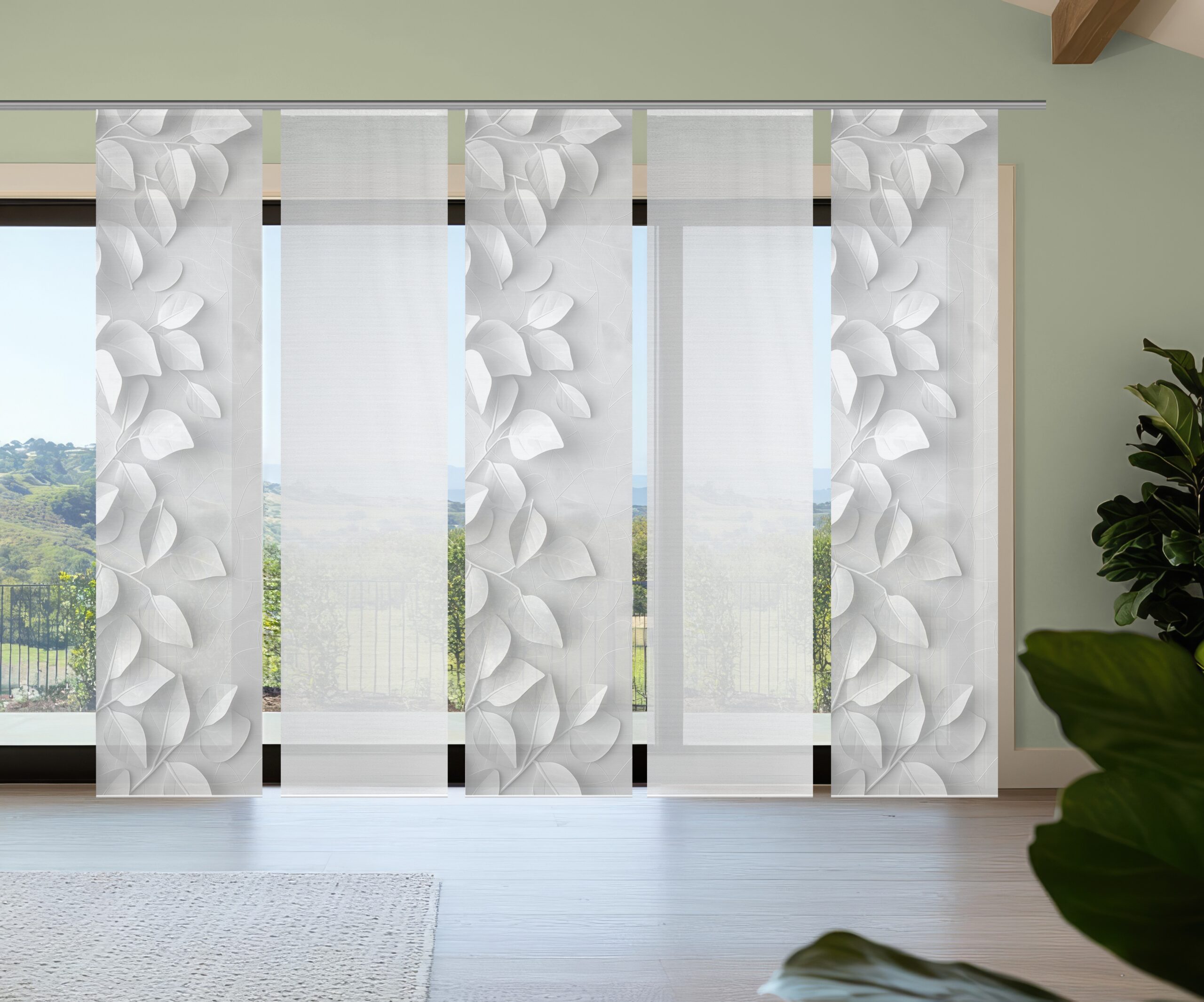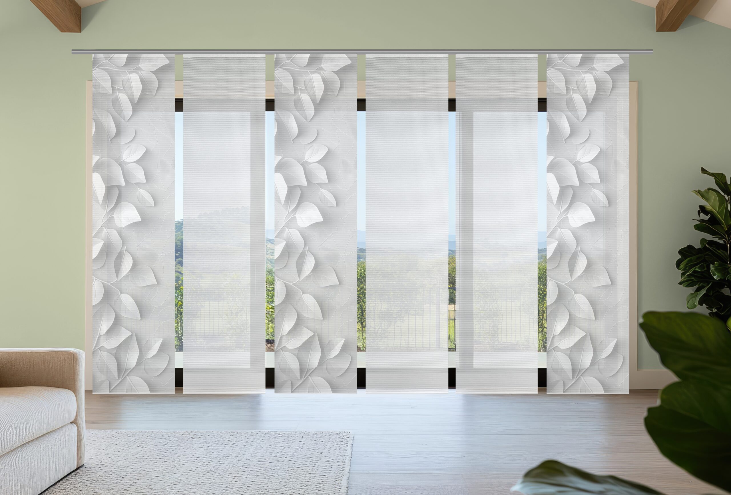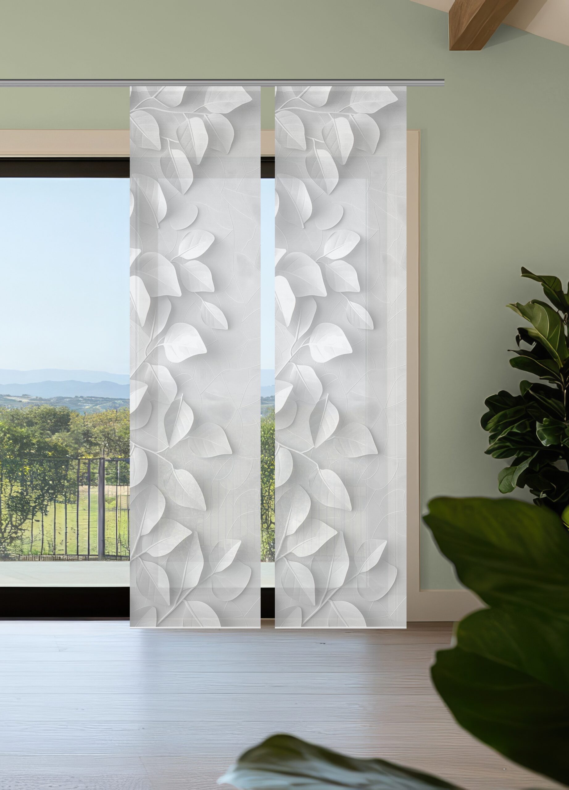 Das abstrakte Blätter-Motiv erstreckt sich über die gesamte linke Vorhangfläche. Mit den vielfältigen Grauschattierungen fügt sich das Schiebevorhang-Set als ein dezentes Gestaltungselement in jeden Einrichtungsstil. Die 3-dimensionale Wirkung ist ein Blickfang in jedem Raum.