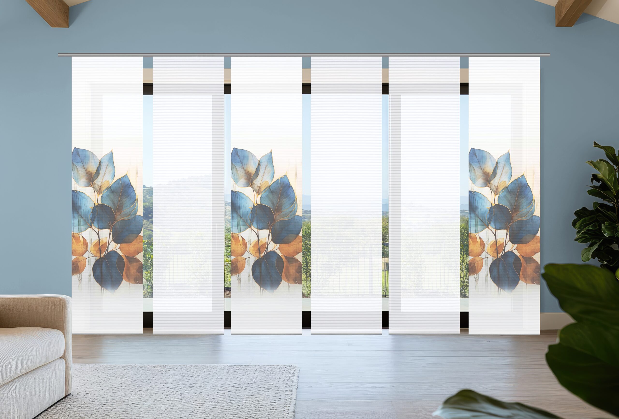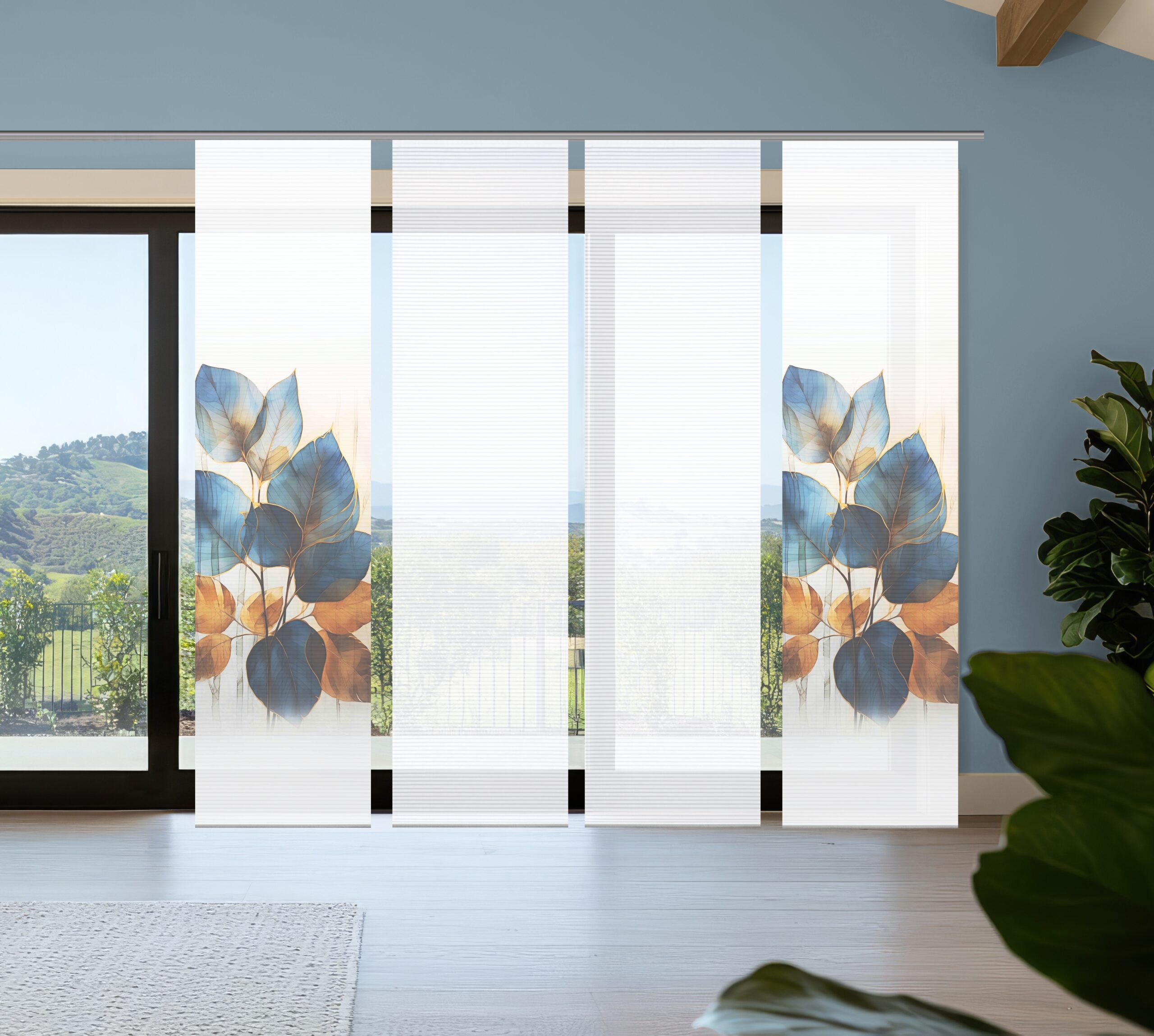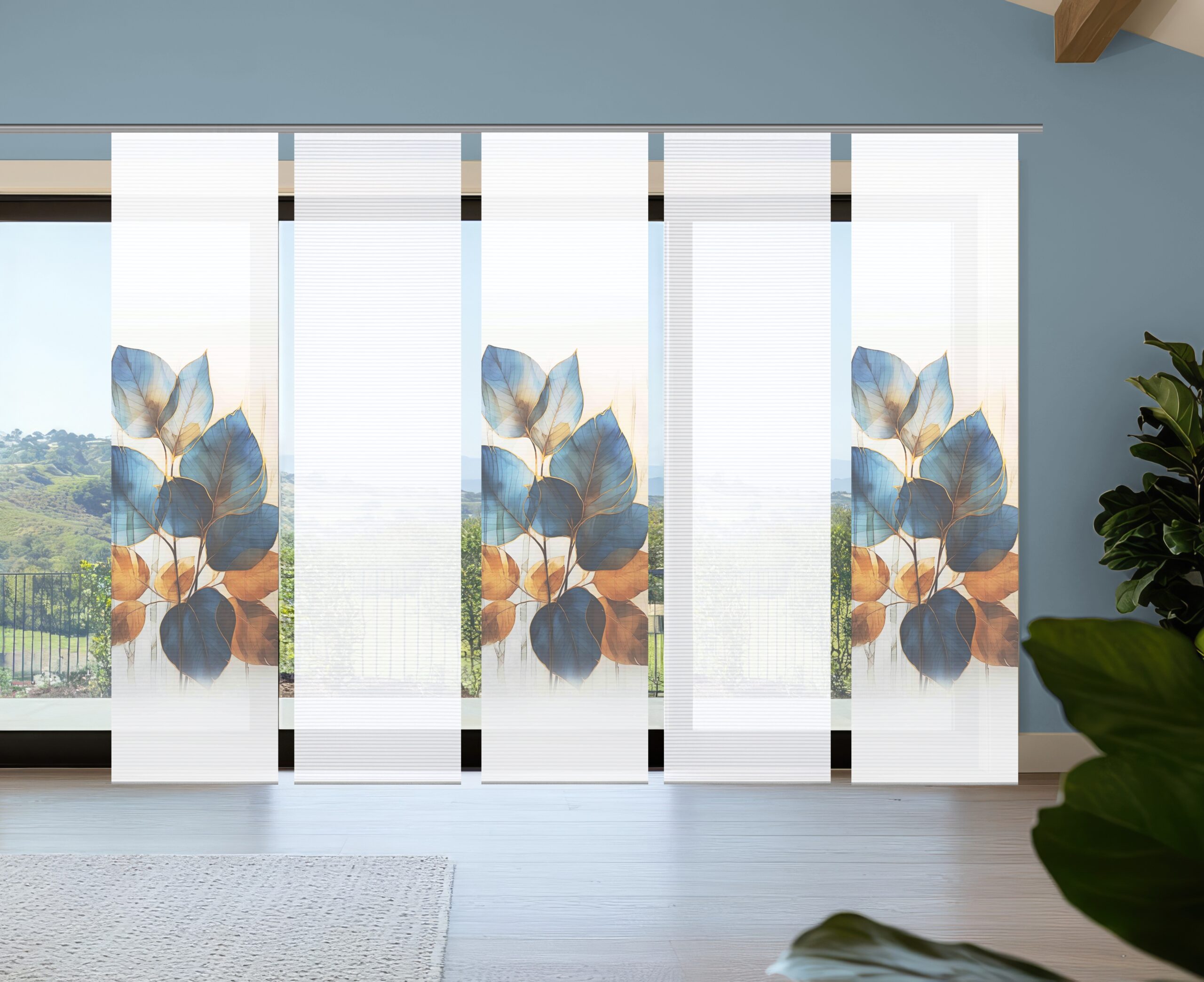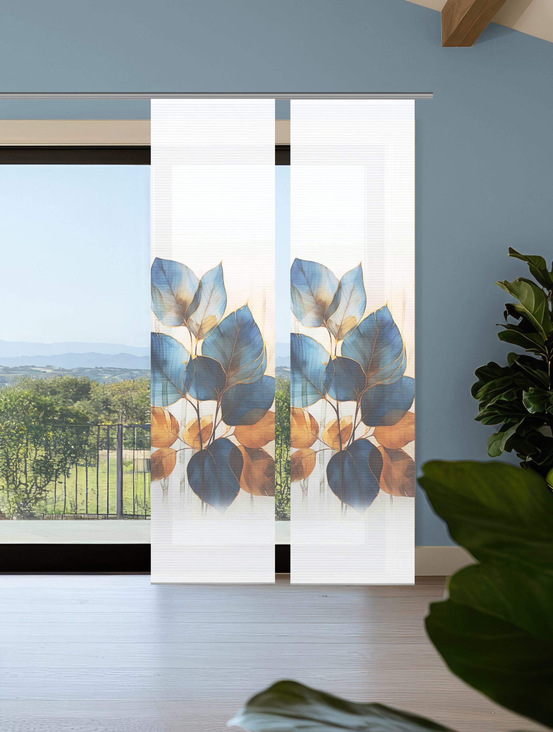 Das Flächenvorhang-Set Thalin kombiniert digital bedruckte Schiebevorhänge mit weißen Uni-Schiebern (je 245 × 60cm). Die halbtransparente „Bambus-Optik“ zeichnet sich aus durch feine Querstreifen – abwechselnd transparent und blickdicht. Das Blätter-Dekor in kräftigen Blau- und Goldtönen setzt sich kontrastreich vom weissen Hintergrund ab. Es erstreckt sich mit seinen übergroßen Blättern über die Mitte der Vorhangfläche und setzt mit seinen intensiven Farben einen starken Akzent.